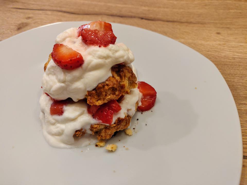Ihned podáváme - houstičky rozřízneme napůl, potřeme šlehačkou a poklademe jahodami.