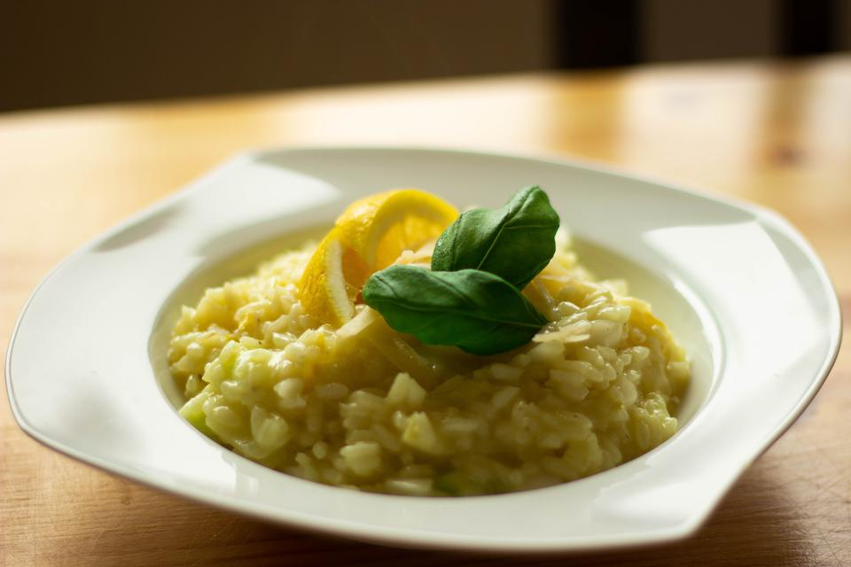 Když je rýže hotová, nastrouháme do ní kůru z půlky citronu, přidáme nastrouhaný parmazán, jarní cibulku a bazalku. Opepříme podle chuti.