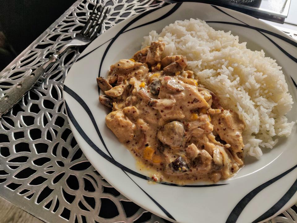 Přidáme hořčici a smetanu, promícháme. Pokud je v pánvi sucho, přidáme vodu.
