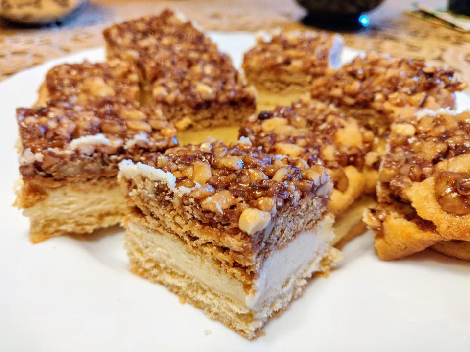 Spodní část těsta (tu bez ořechů) pokapeme rumem, naneseme na ni krém a přiklopíme druhou plackou